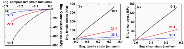 基于上述應變場測量結果,本文研究進一步獲得不同固化劑占比的PDMS在單軸壓縮、單軸拉伸和簡單剪切工況下的應力-應變關系曲線,如圖5所示。結果表明,固化劑占比越高,PDMS的表觀模量越大。不同變形模式下PDMS的力學行為存在較大差異,單軸壓縮工況下非線性行為顯著,應變硬化行為占主導地位;簡單剪切工況下PDMS表現出近似線彈性的應力-應變關系;而在單軸拉伸下,當固化劑占比較高(10:1)時,PDMS呈現出先軟化后硬化的非線性響應,而在固化劑占比較低時僅表現出應變軟化。這一現象可能與本文所研究的中等應變范圍有關。